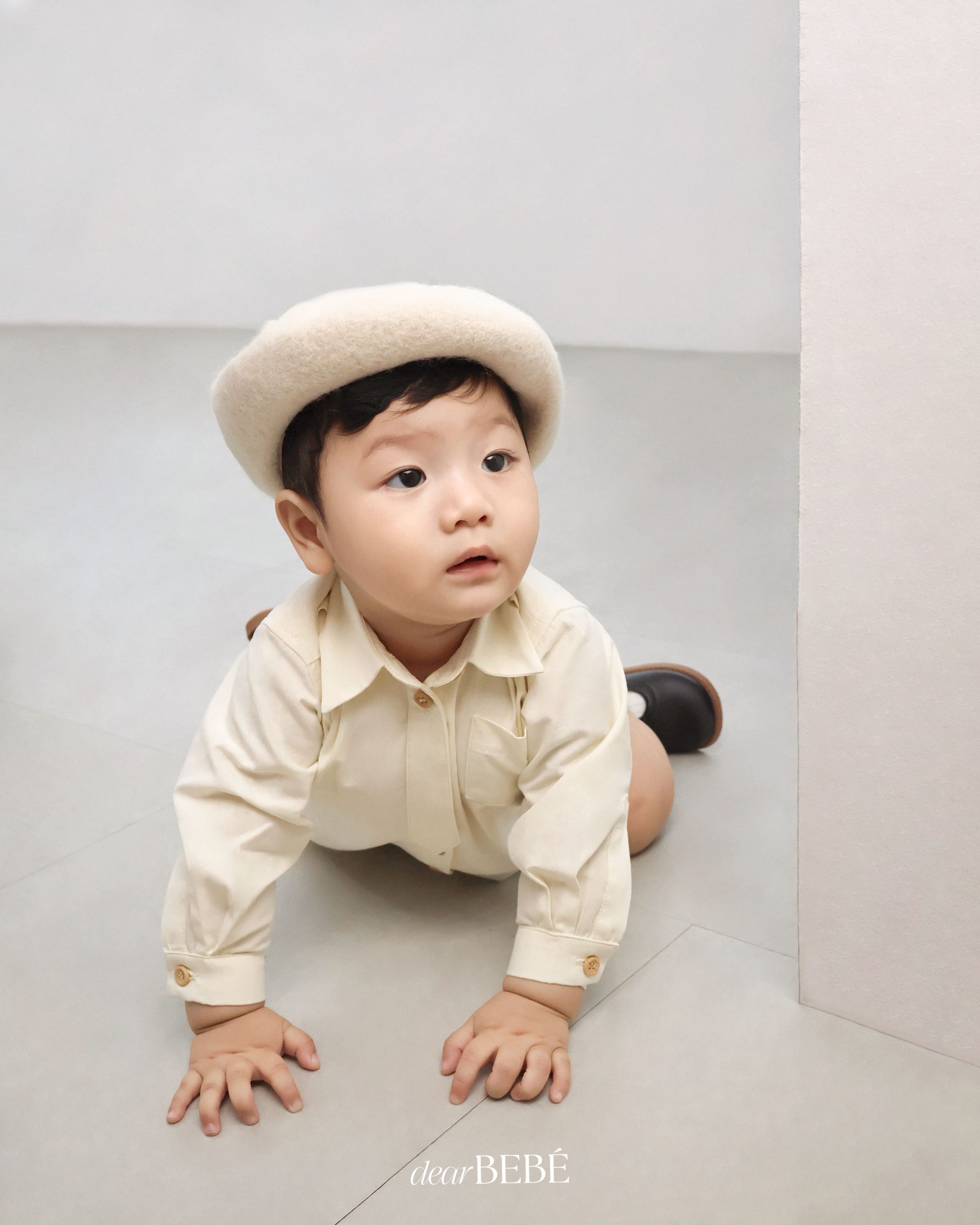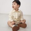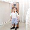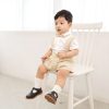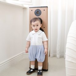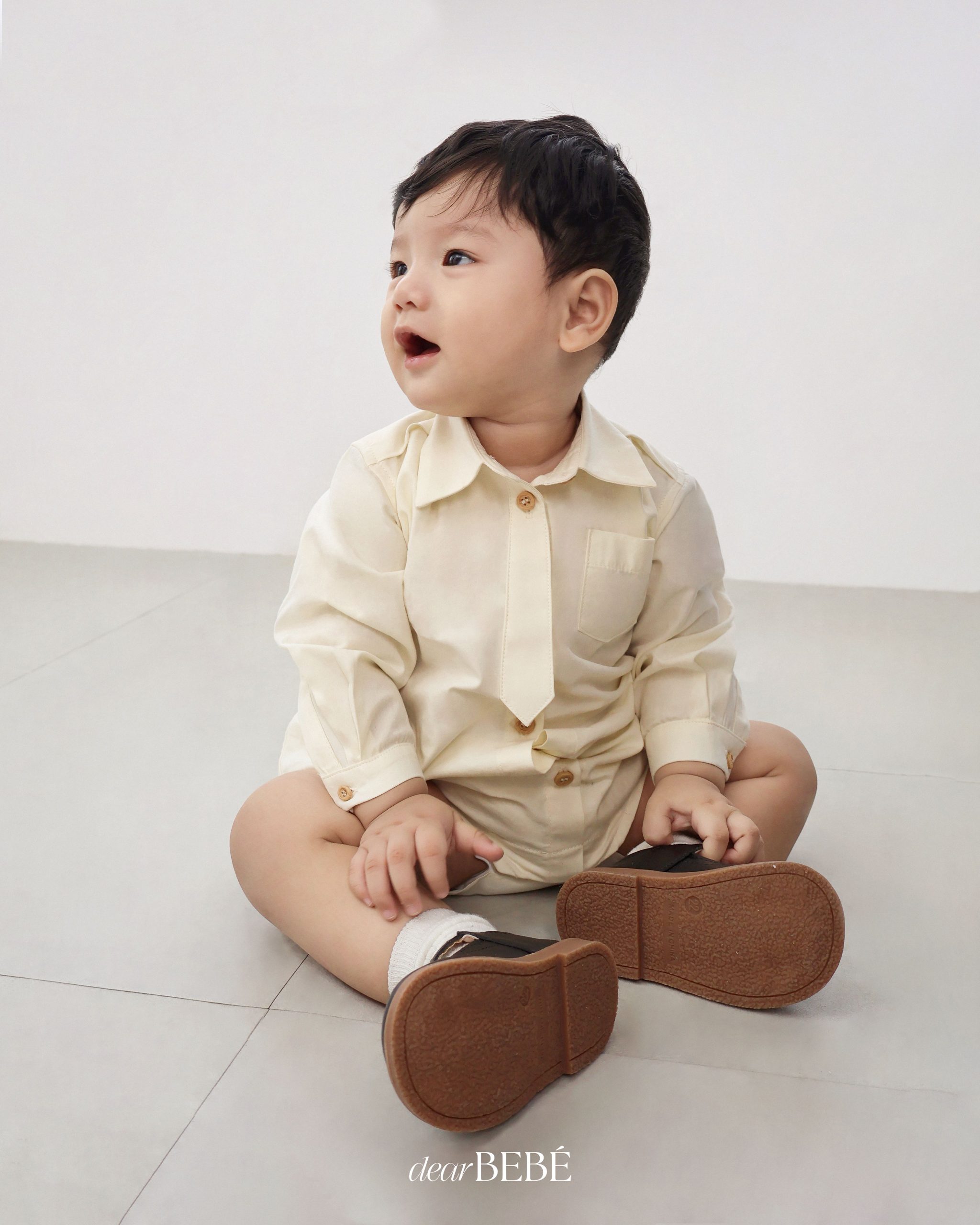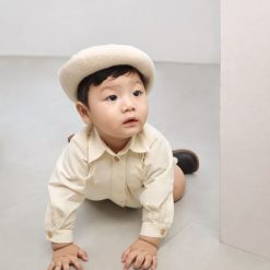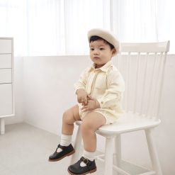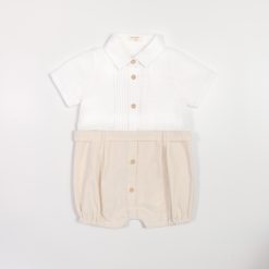 Romper dáng sơ mi cổ Đức, có hàng khuy màu nâu trước ngực. Điểm nhấn đặc biệt của bộ romper là chiếc cà vạt nhỏ được thiết kế cố định, giúp bé không bị khó chịu khi mặc và vẫn đảm bảo sự an toàn. Có nút bấm ở đũng tiện dụng.