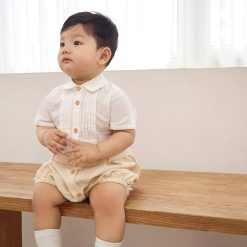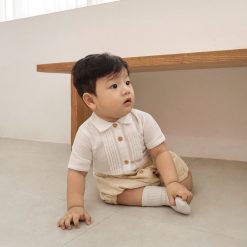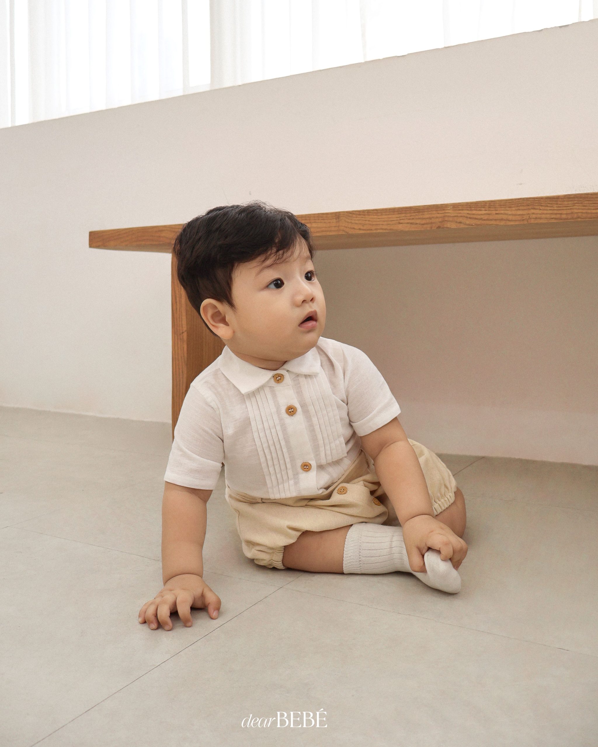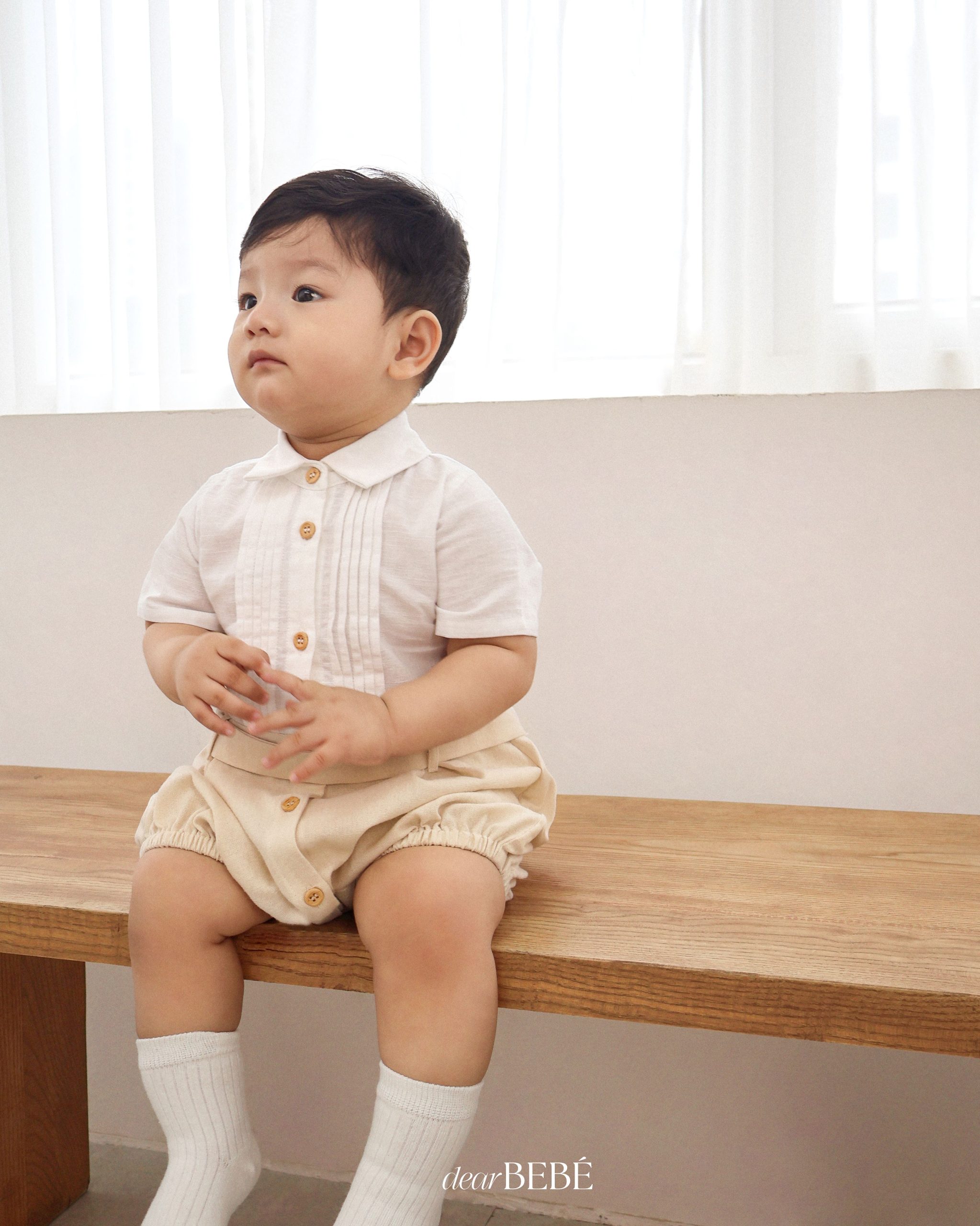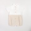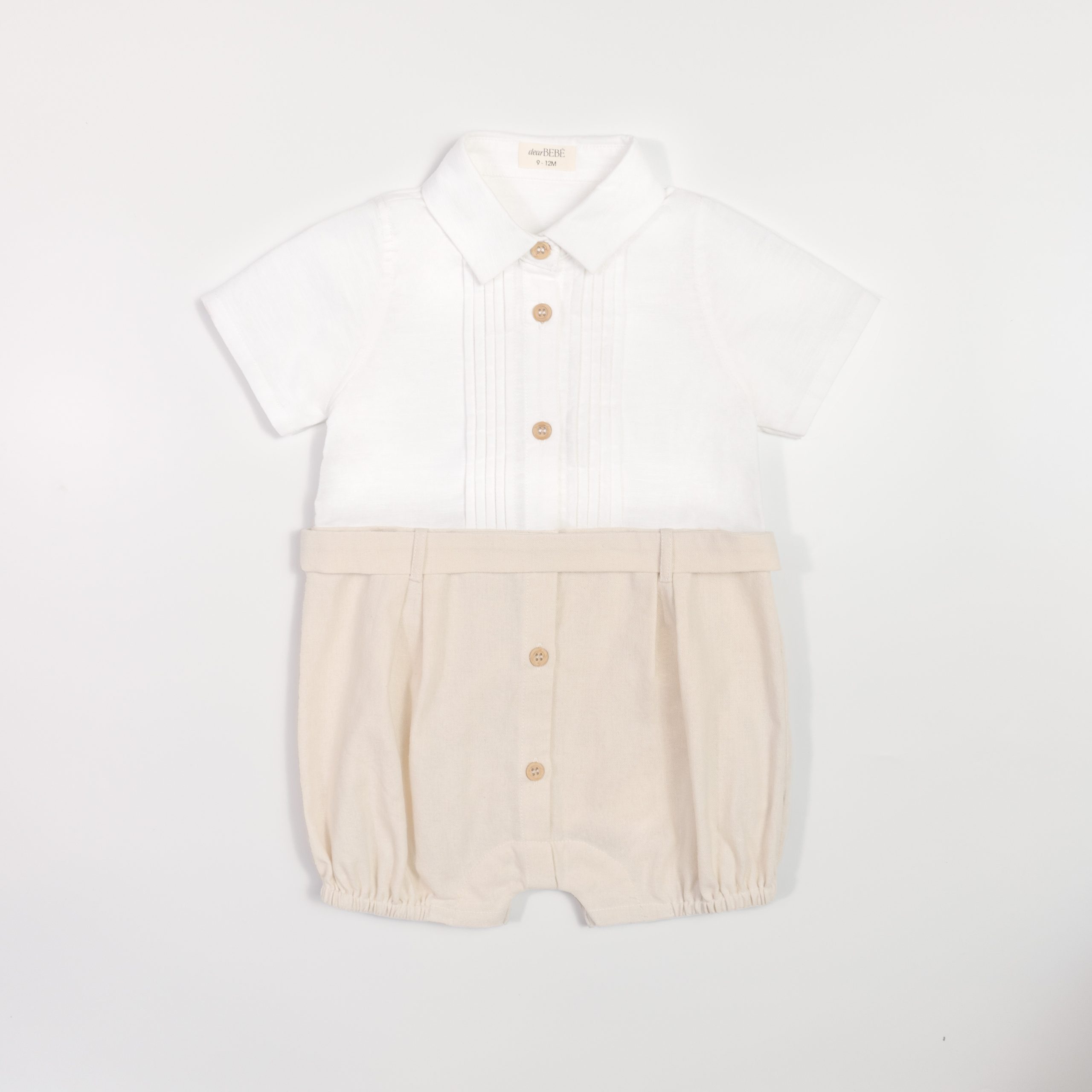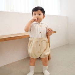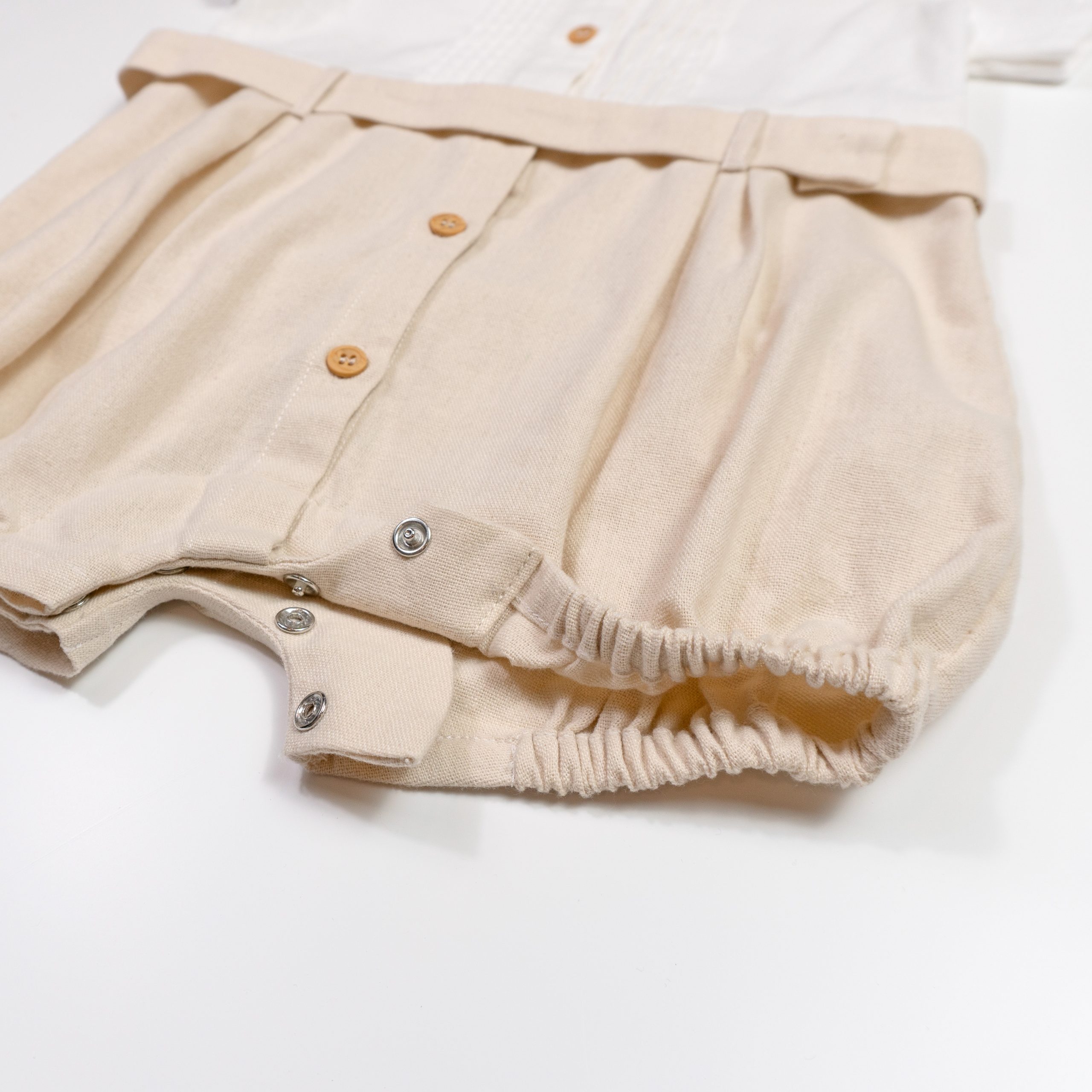 Áo liền quần ngắn tay cổ Đức, có chi tiết xếp ly phần thân trên. Thắt lưng có thể tháo rời, cài bằng hàng khuy phía trước. Gấu quần bo thun co giãn, cài khuy bấm ở đũng.