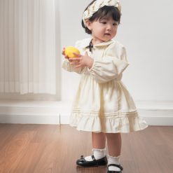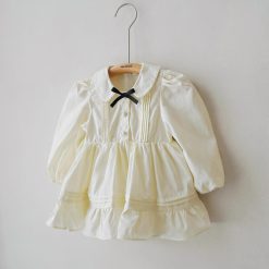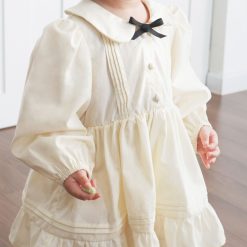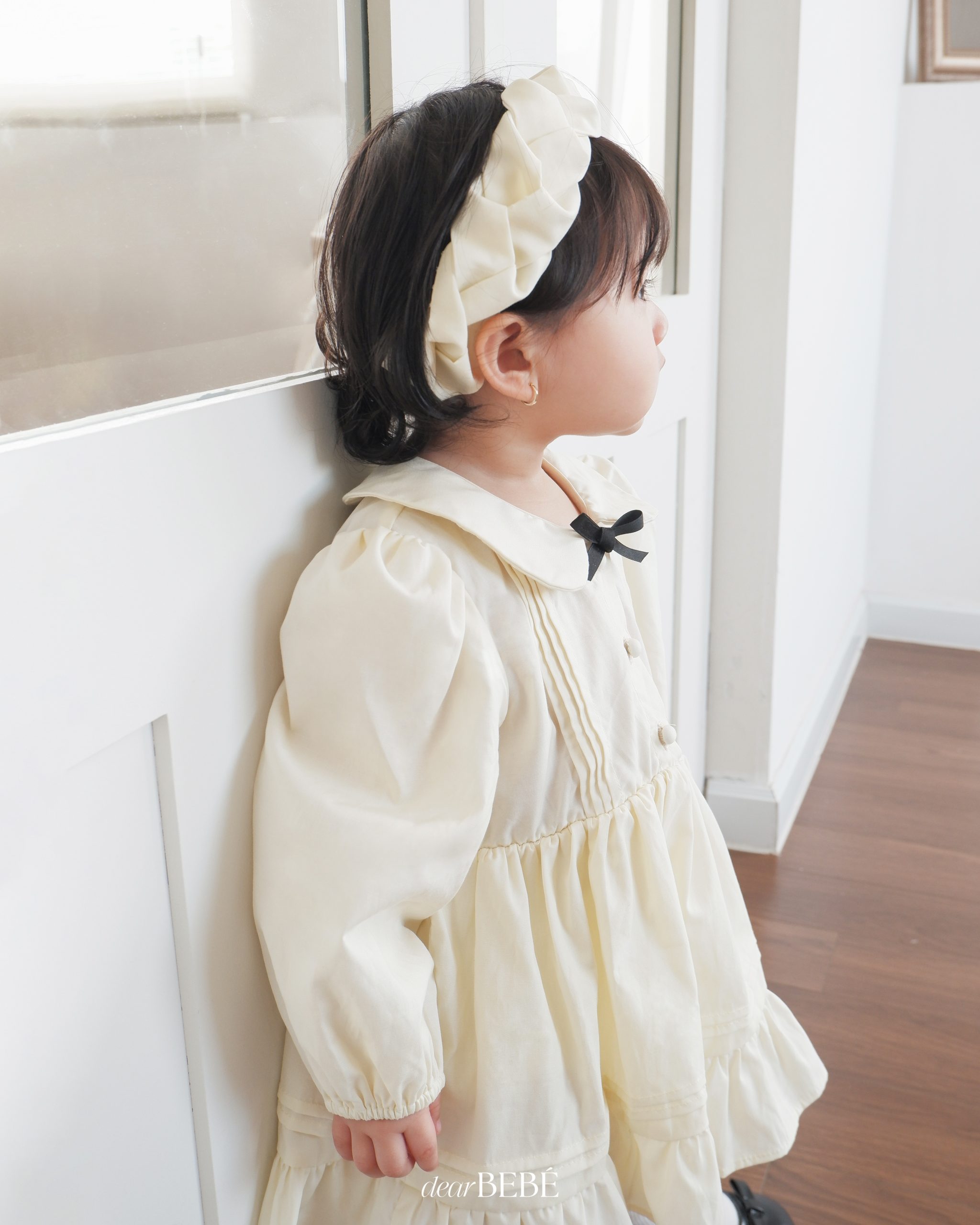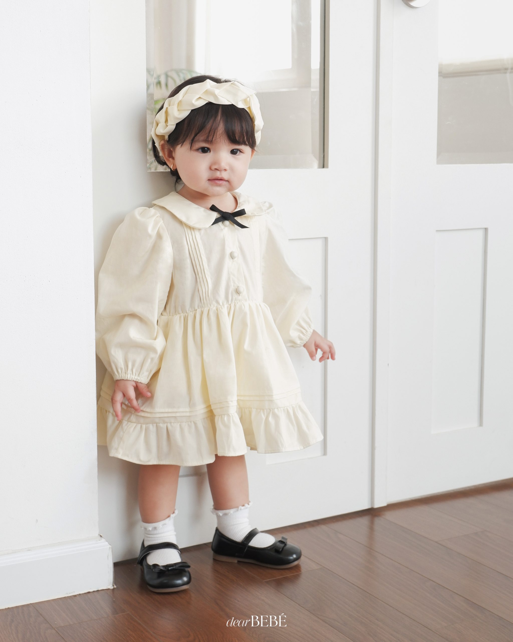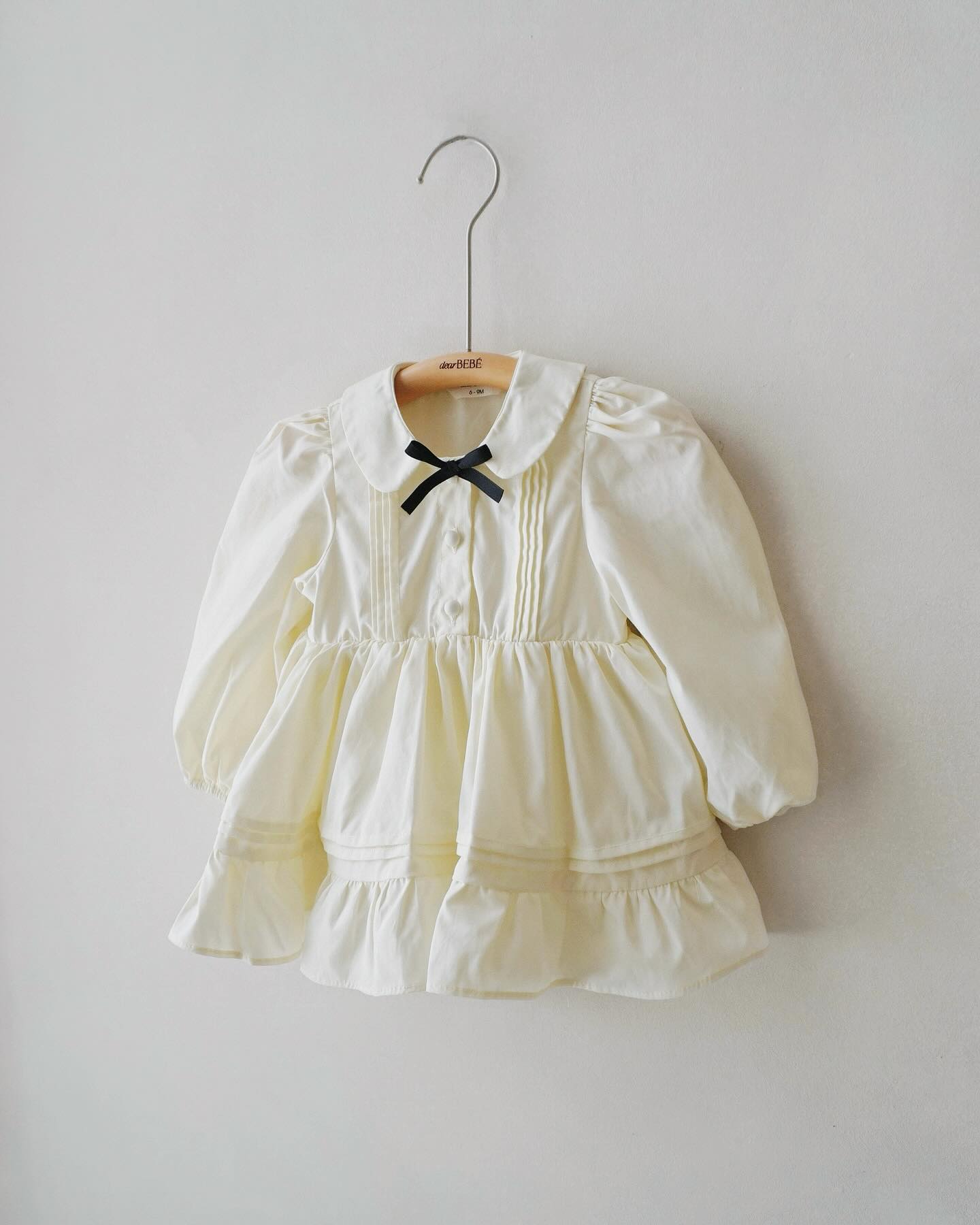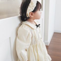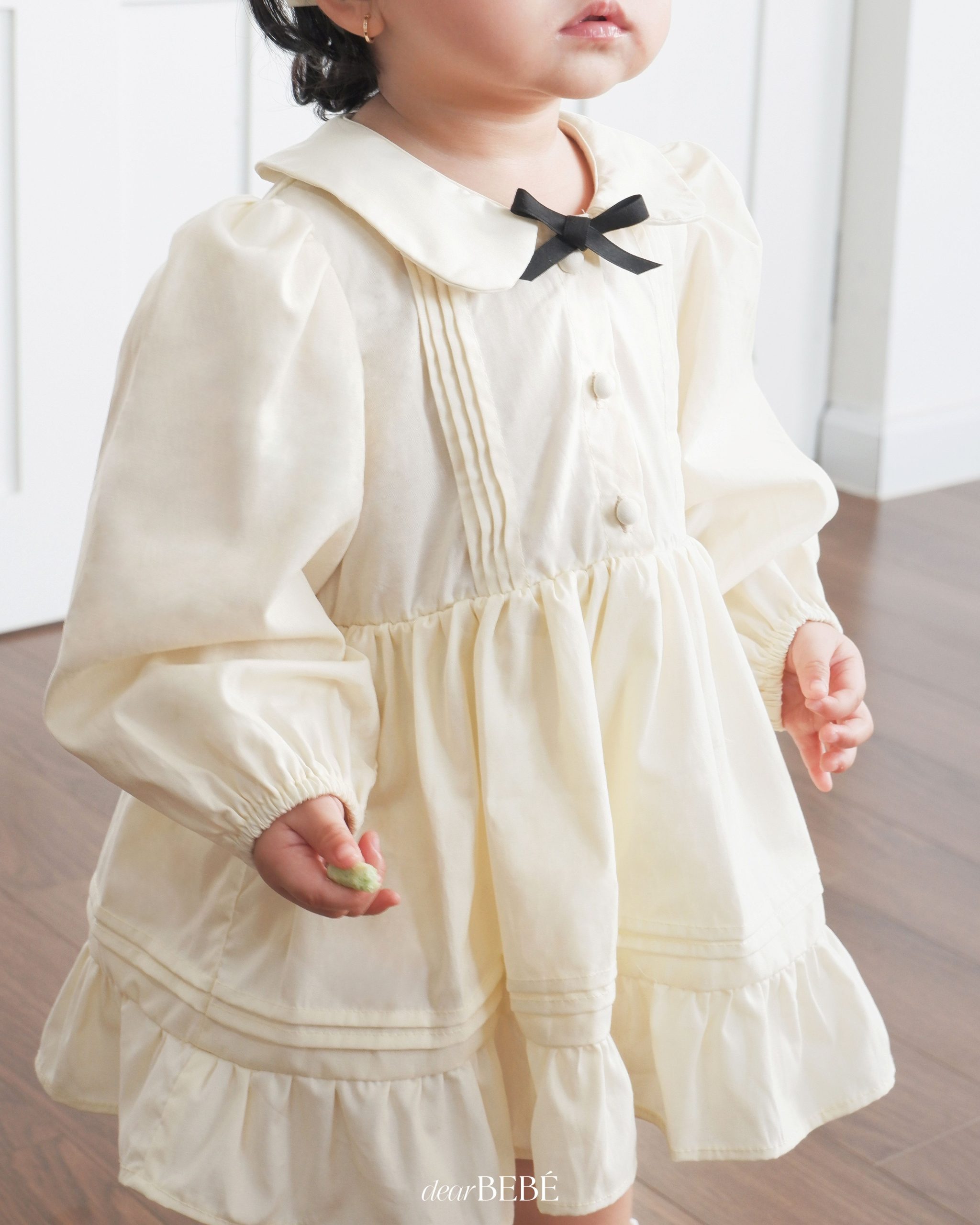 Bodysuit dài tay dáng váy, cổ sen phối nơ trang trí và chi tiết xếp ly, có hàng khuy phía trước.