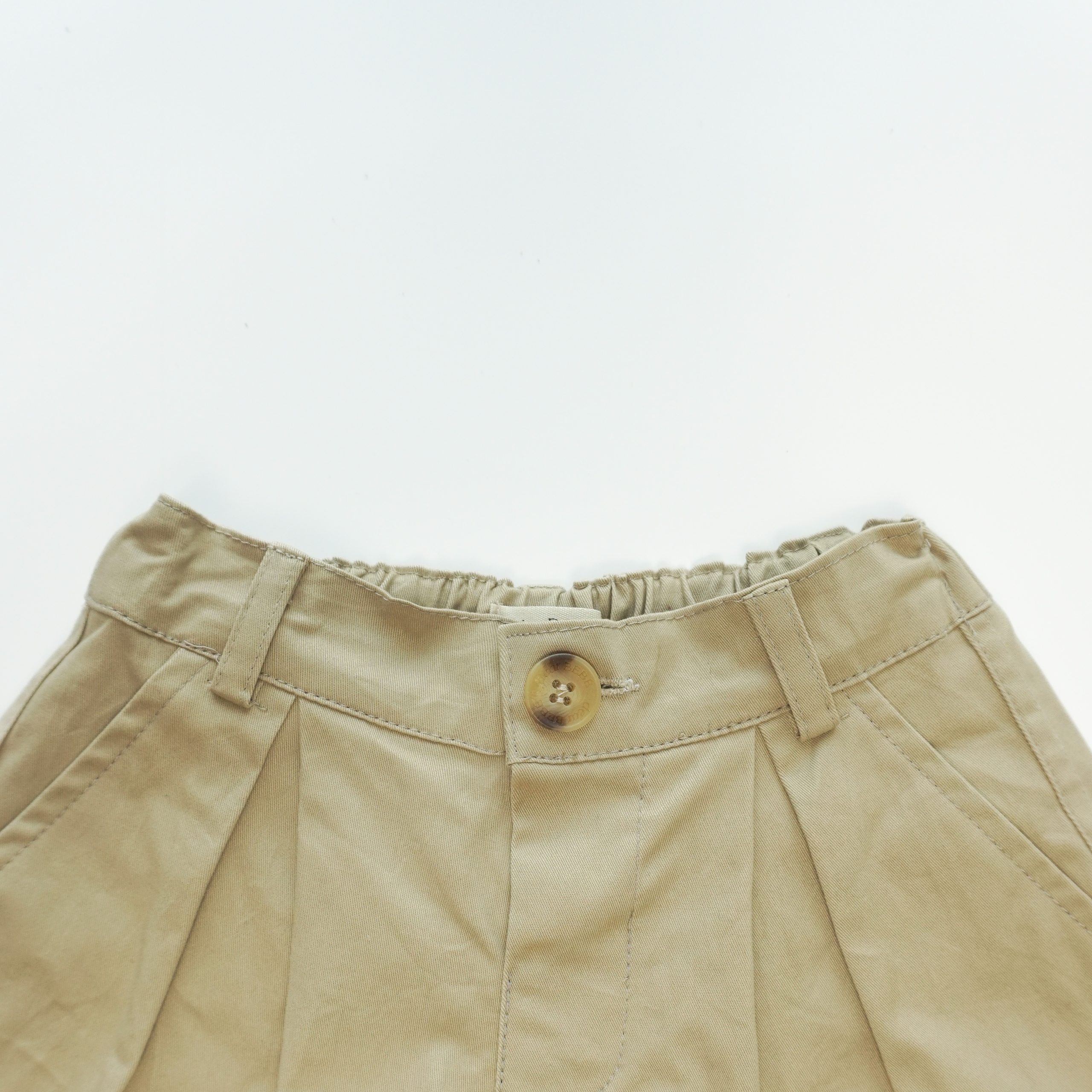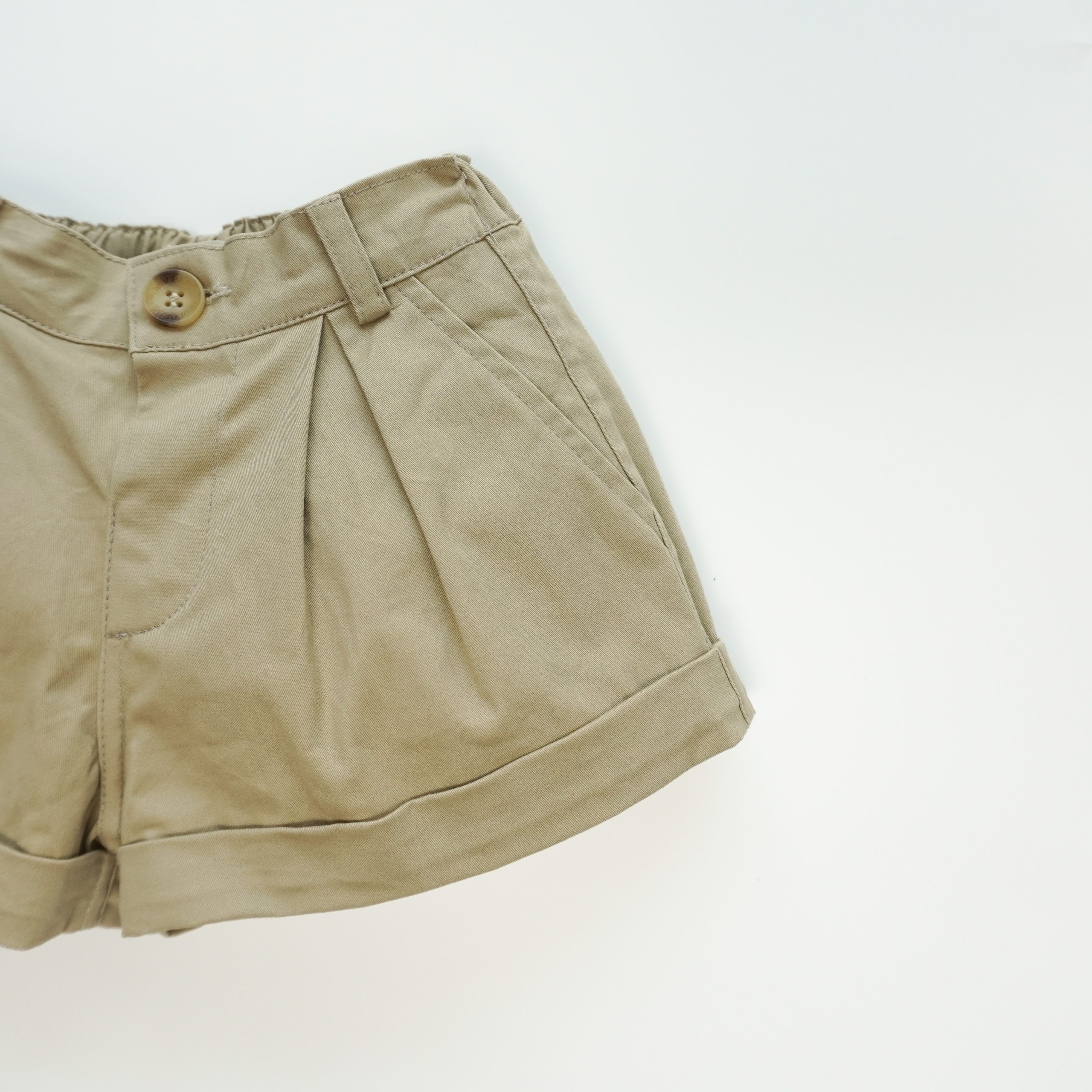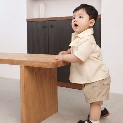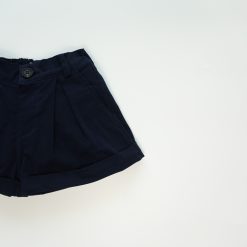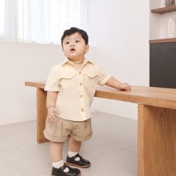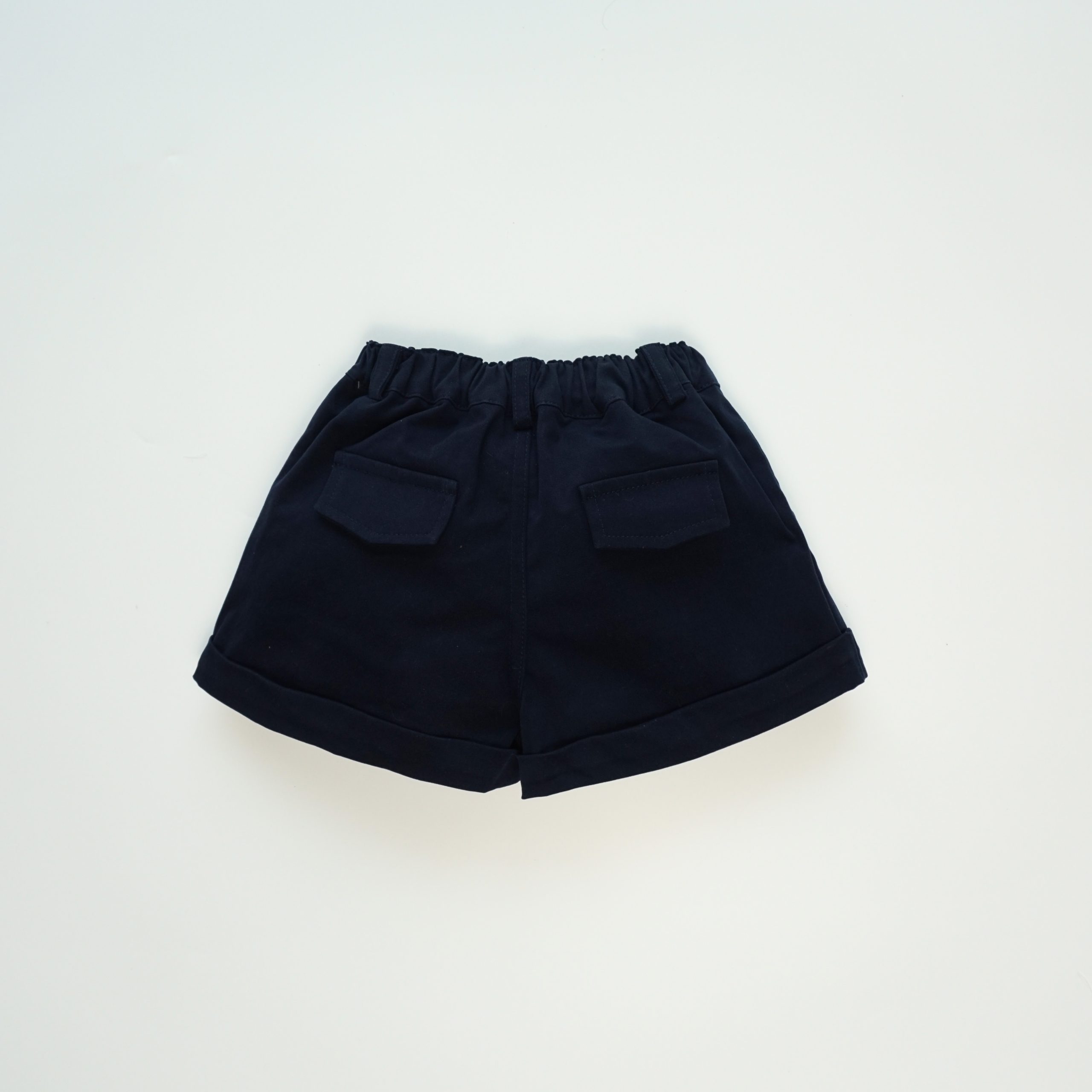 Quần short có túi hai bên, nắp túi giả trang trí phía sau. Lai quần được may gấp mép tạo điểm nhấn. Phần cạp lưng quần có thun co giãn có thể điều chỉnh được.