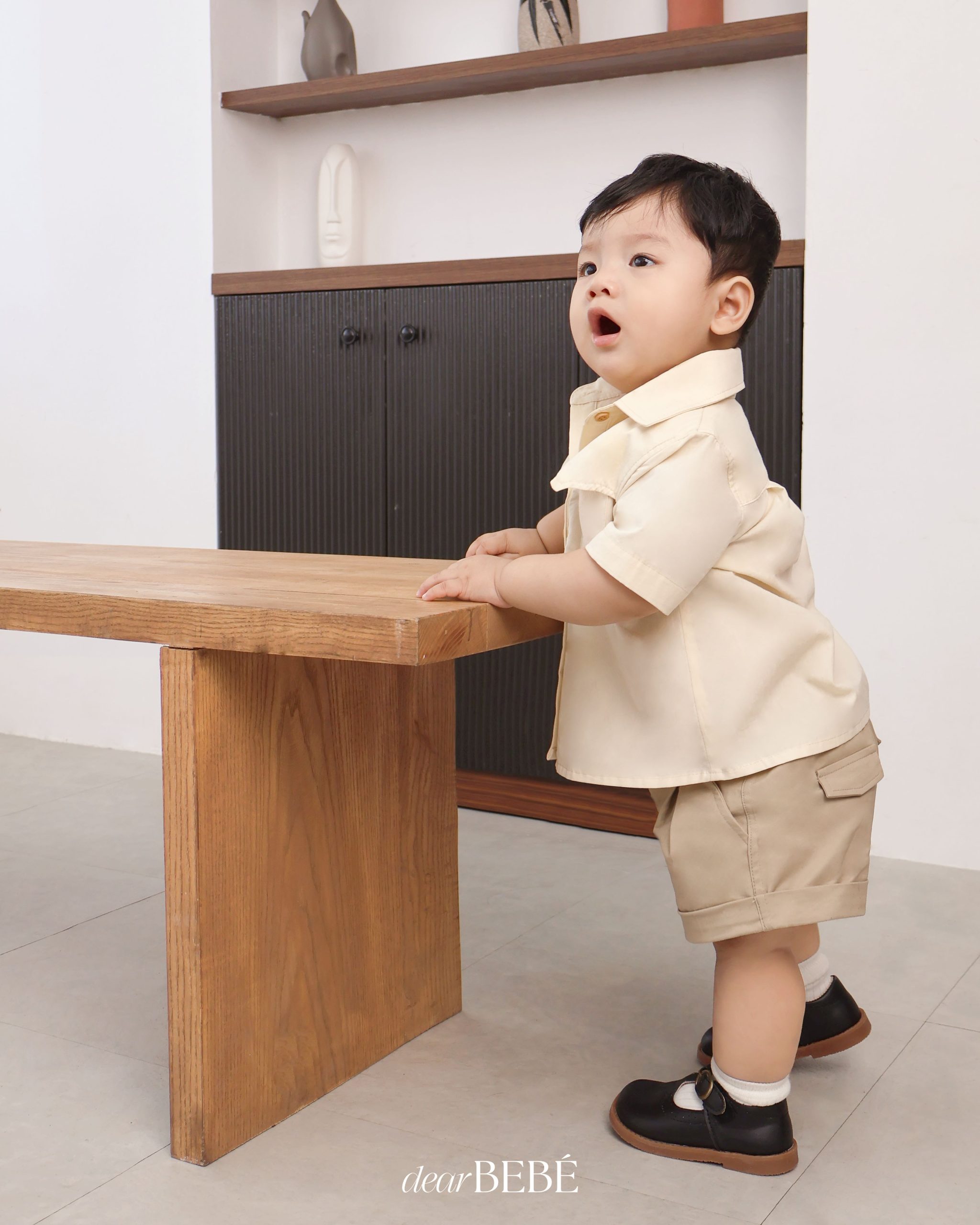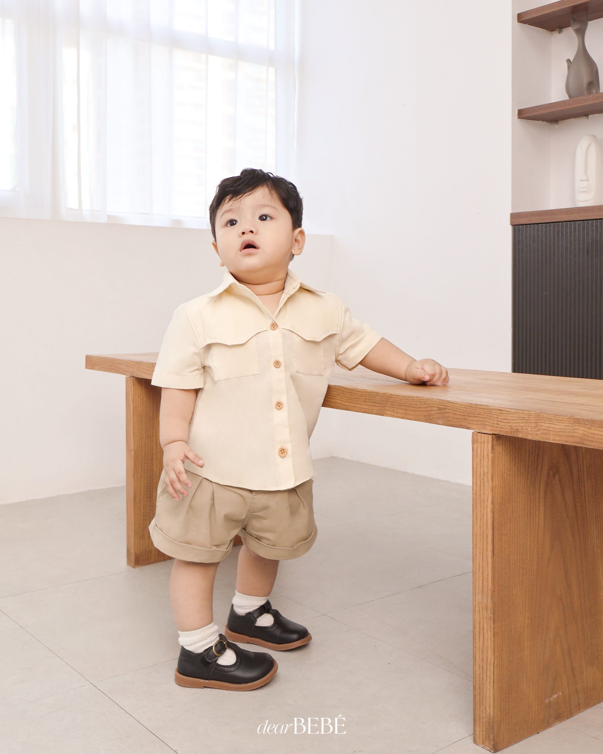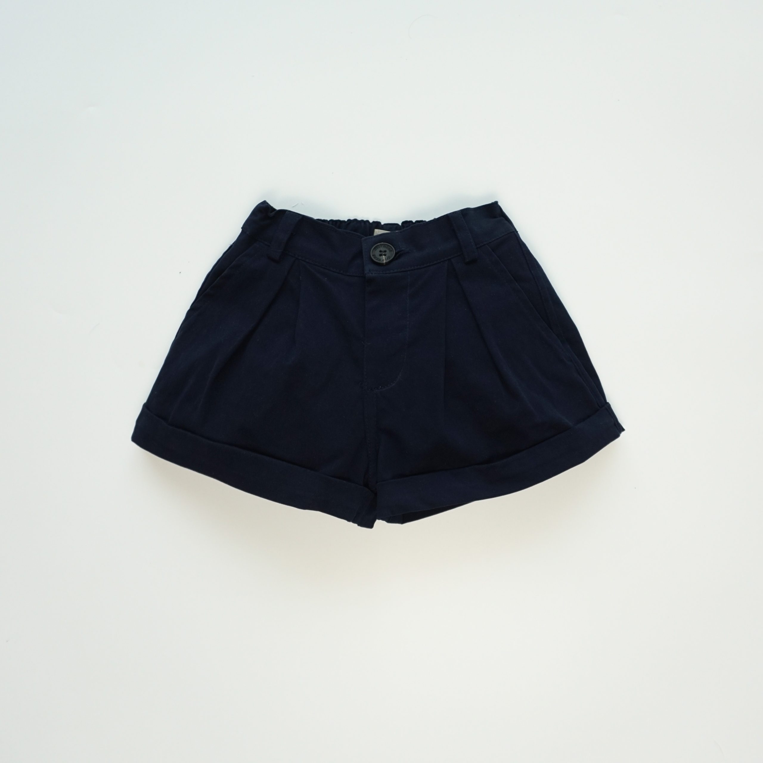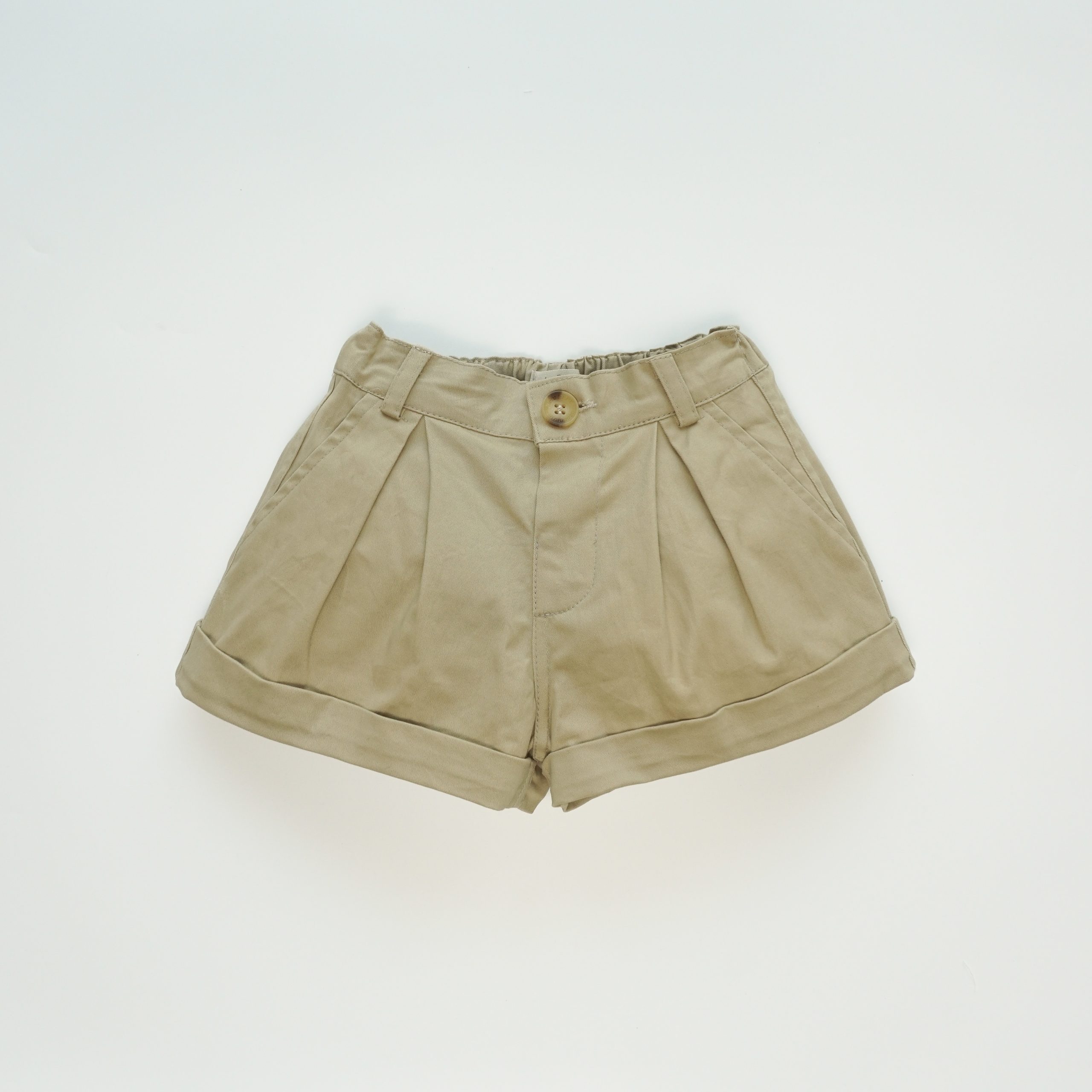 Quần short có túi hai bên, nắp túi giả trang trí phía sau. Lai quần được may gấp mép tạo điểm nhấn. Phần cạp lưng quần có thun co giãn có thể điều chỉnh được.