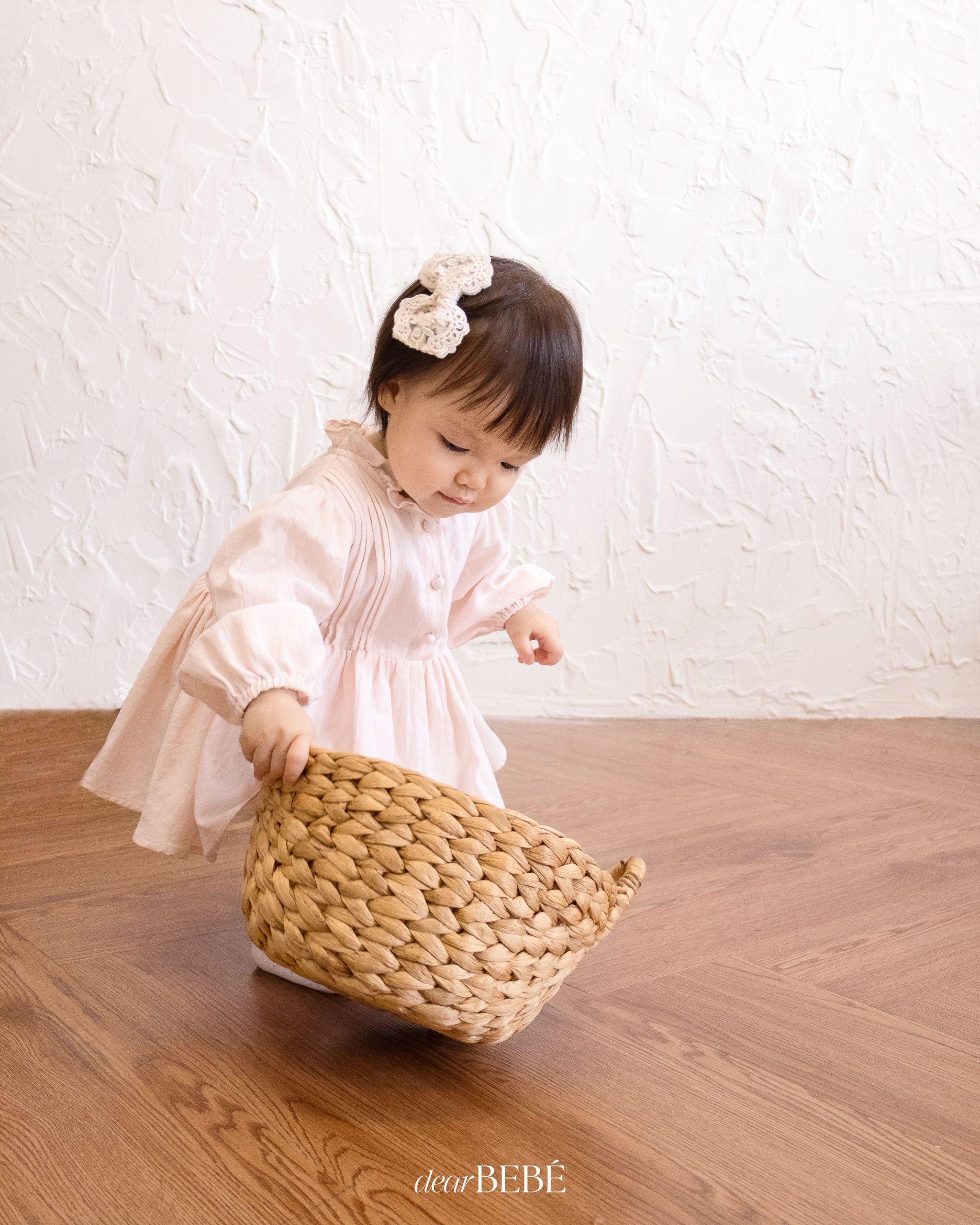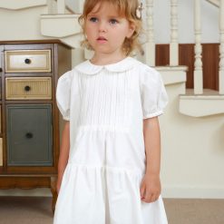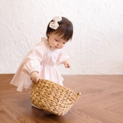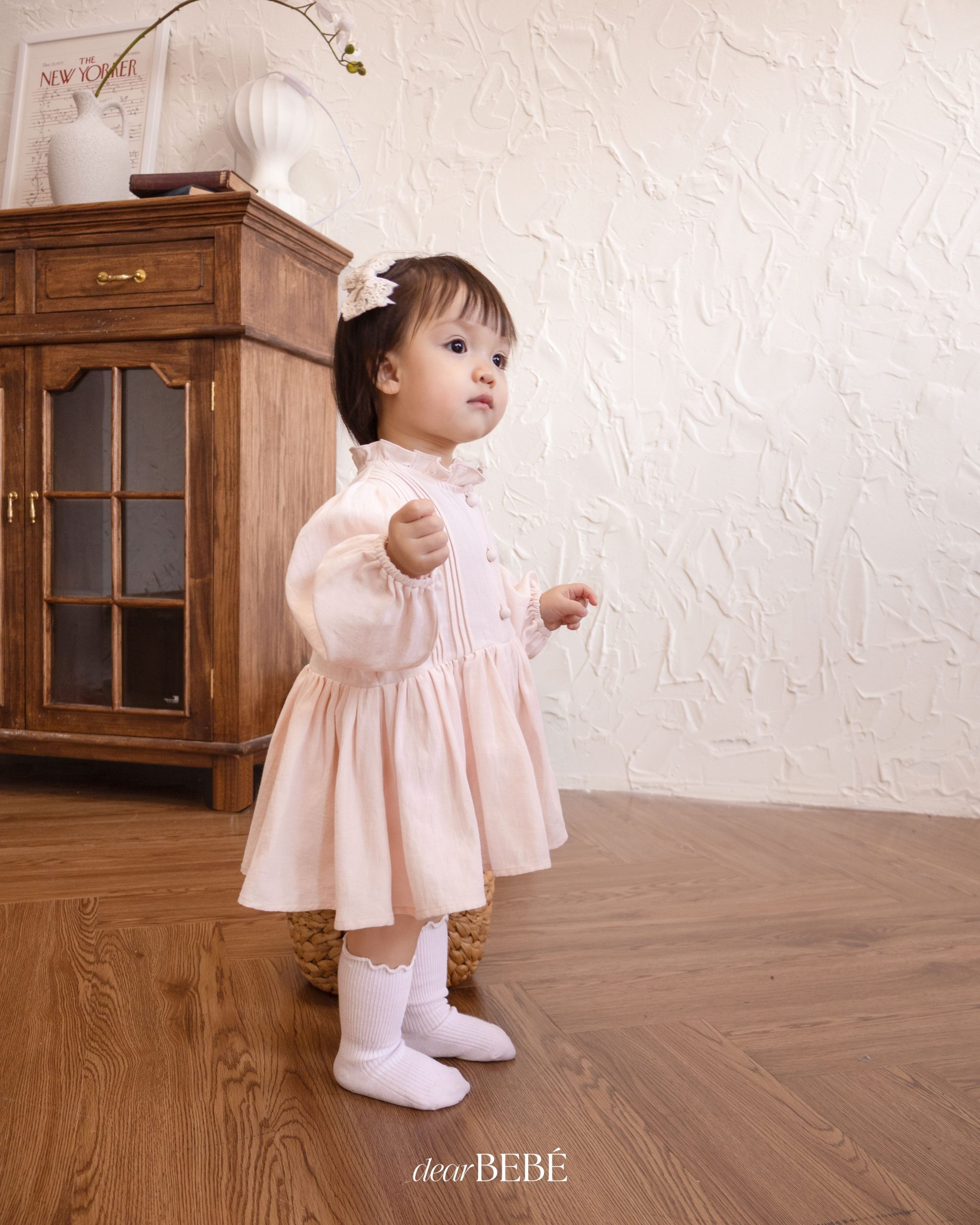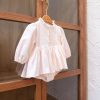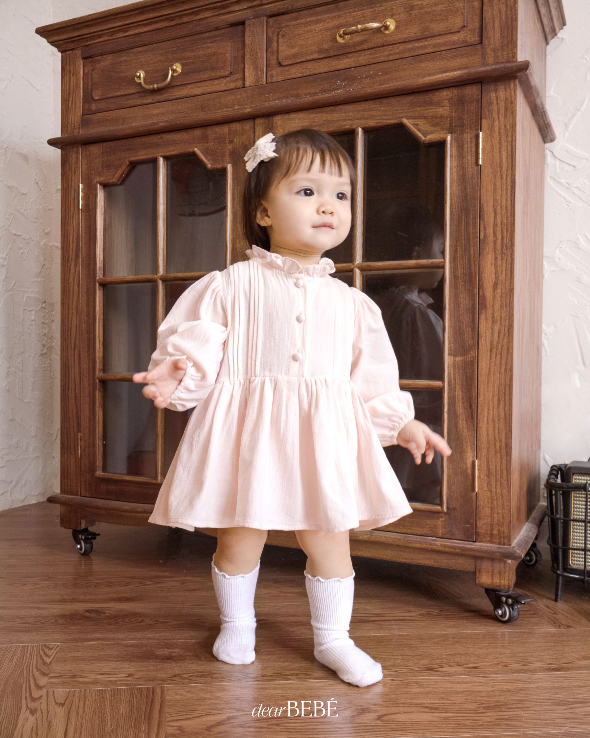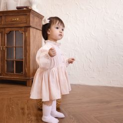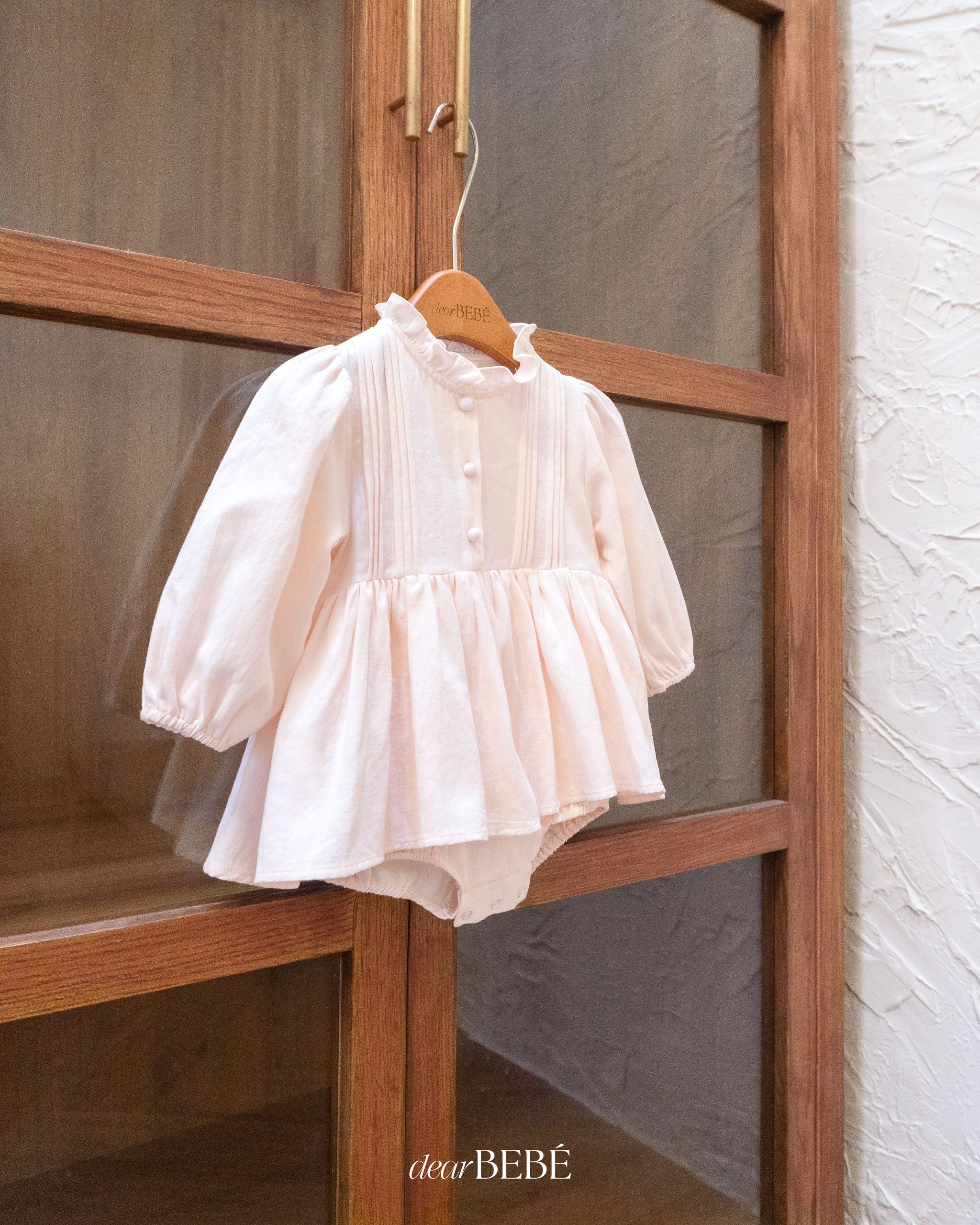 Váy liền quần, cổ tròn phối bèo, tay dài bo thun co giãn. Có hàng khuy đóng mở phía trước. Có cúc bấm tiện lợi ở đũng. Phối chi tiết xếp ly trước ngực