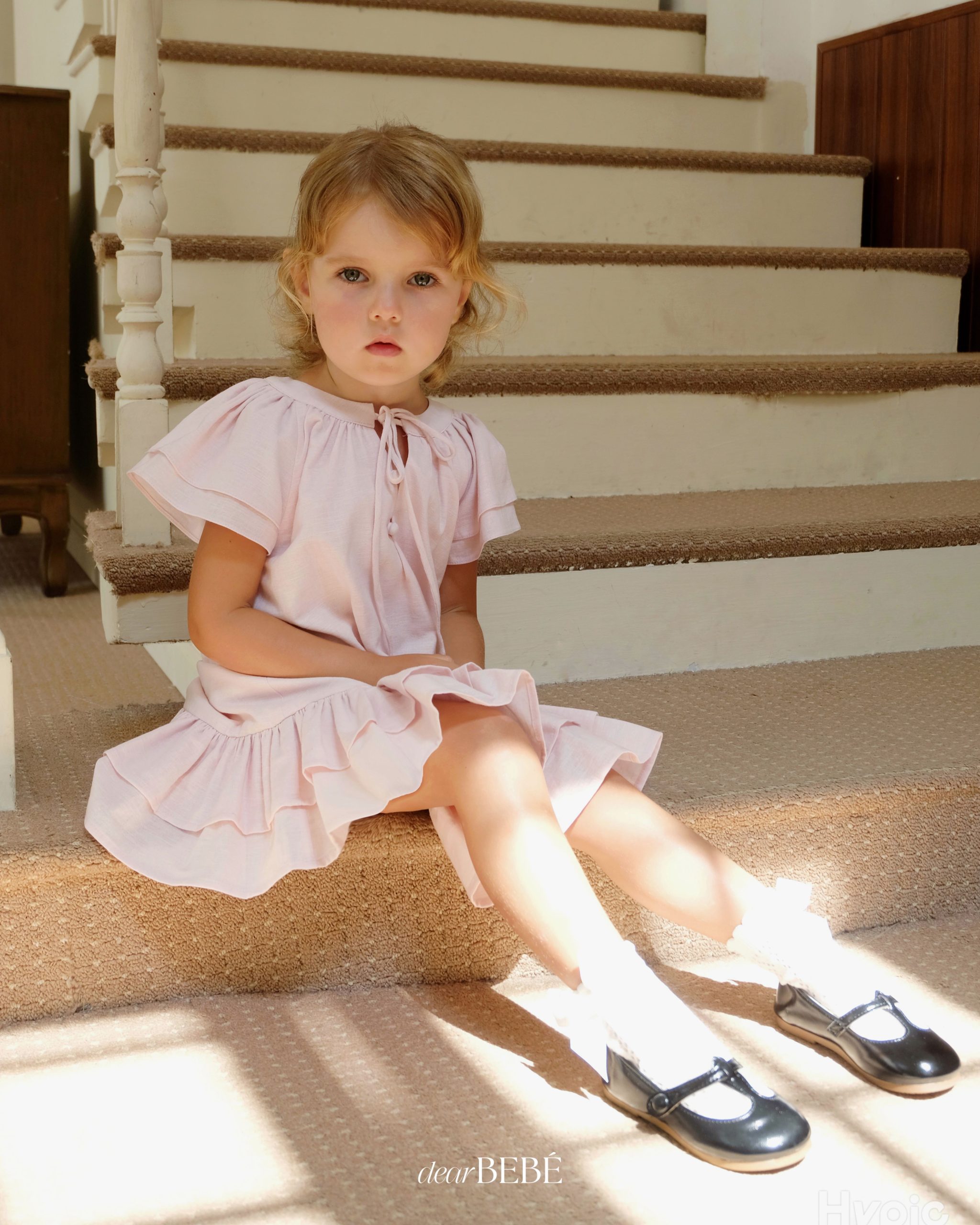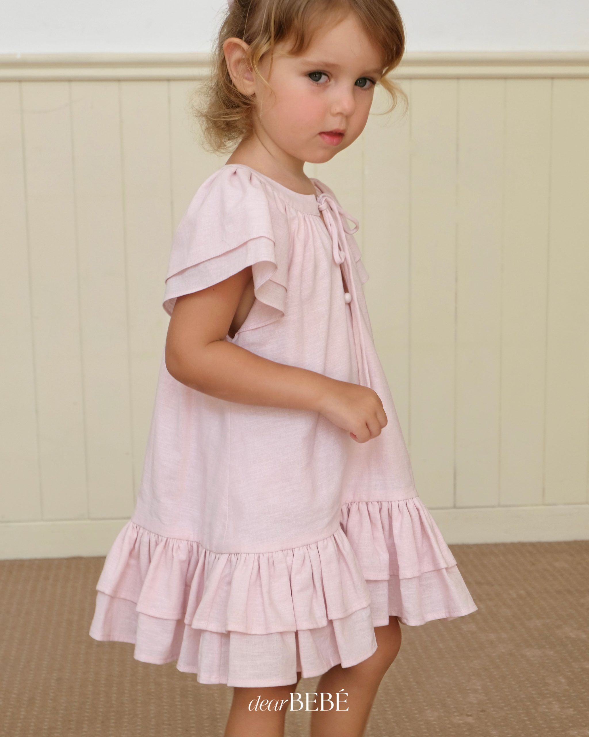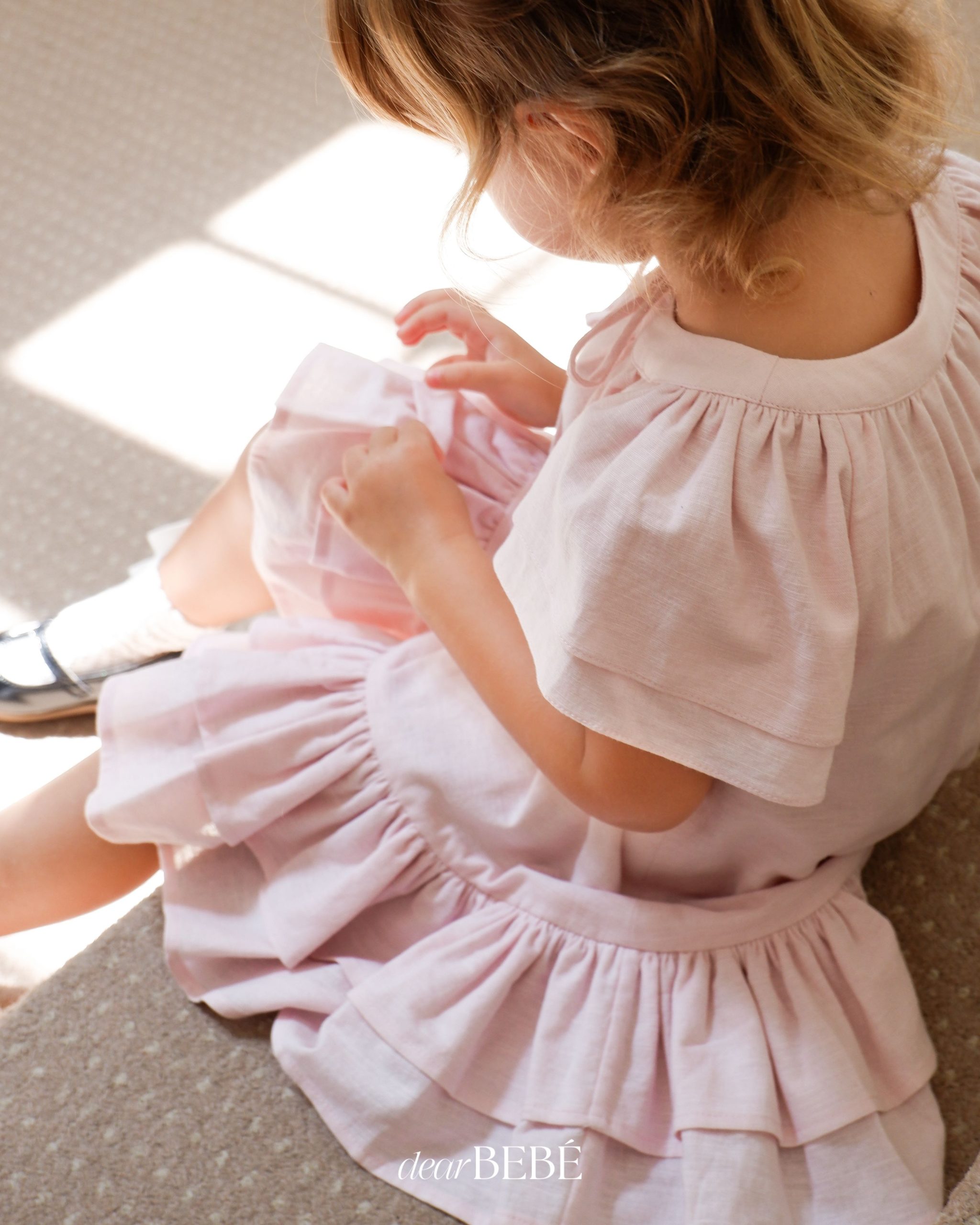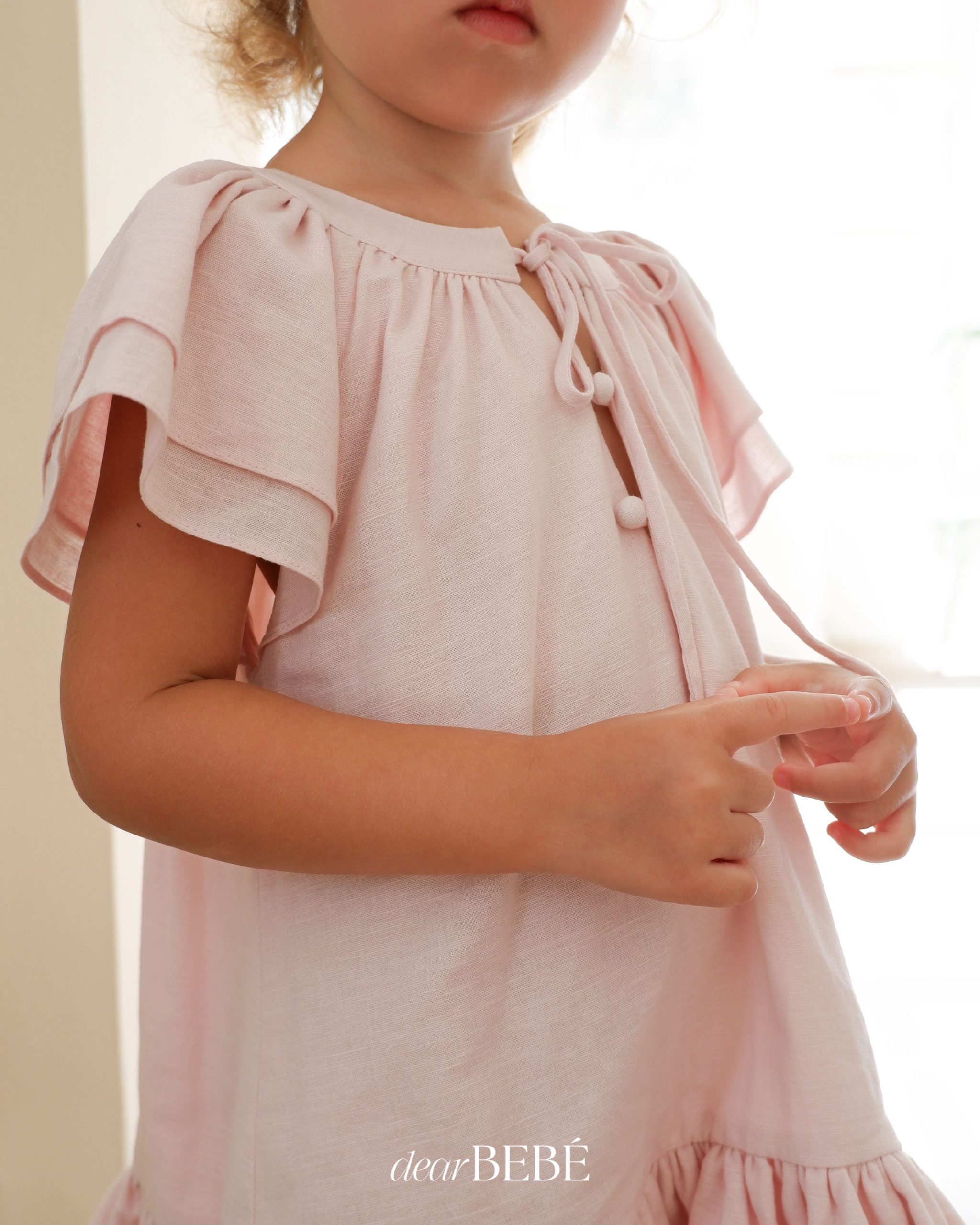 Dear BEBÉ giới thiệu đến bạn thiết kế đầu tiên trong BST Dear Summer 2025 mang theo hơi thở mùa hè dịu dàng và trong trẻo. Mẫu váy được thiết kế dáng chữ A nhẹ nhàng, cùng điểm nhấn 2 tầng bèo và chi tiết nơ ở cổ, tạo nên vẻ ngoài ngọt ngào cho bé yêu của bạn. Chất vải linen – cotton tự nhiên, mềm mịn và thấm hút tốt, giúp bé thoải mái vui chơi cả ngày dài.